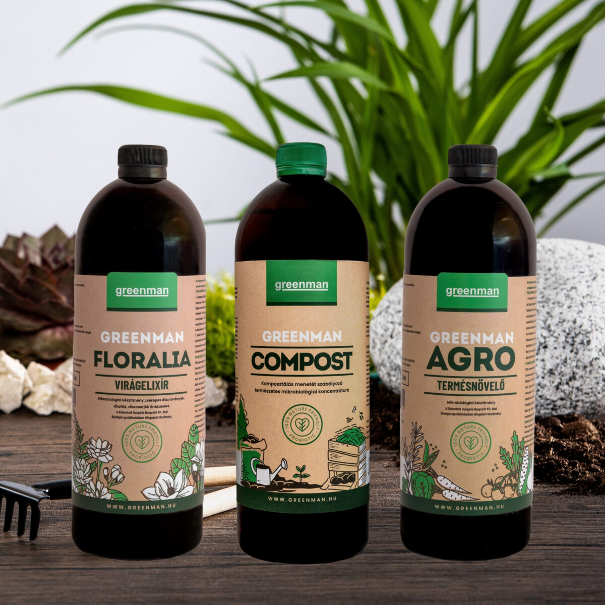 A csomag tartalma egy 1 literes GREENMAN AGRO, egy 1 literes GREENMAN FLORALIA és egy 1 literes GREENMAN COMPOST.